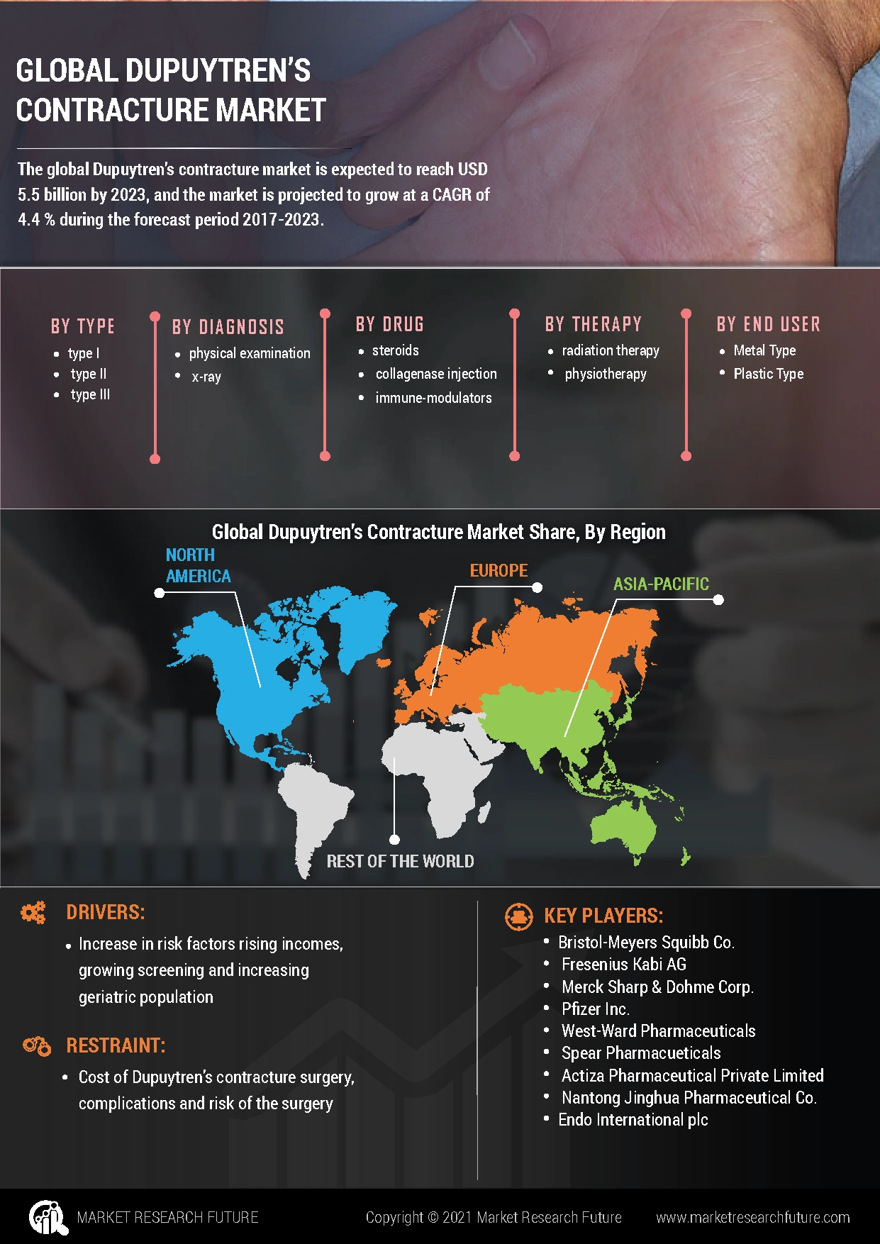 WWW.MARKETRESEARCHFUTURE.COMDupuytren’s Contracture Market Size, Share | Industry ForecastDupuytren’s Contracture Market to reach USD 6.68 Billion at 4.77% CAGR during the forecast period, Dupuytren’s Contracture Industry Analysis By Types, Diagnosis, Surgery, Drug, Therapy, End-User and Region0 Comments 0 Shares 16 Views 0 Reviews -