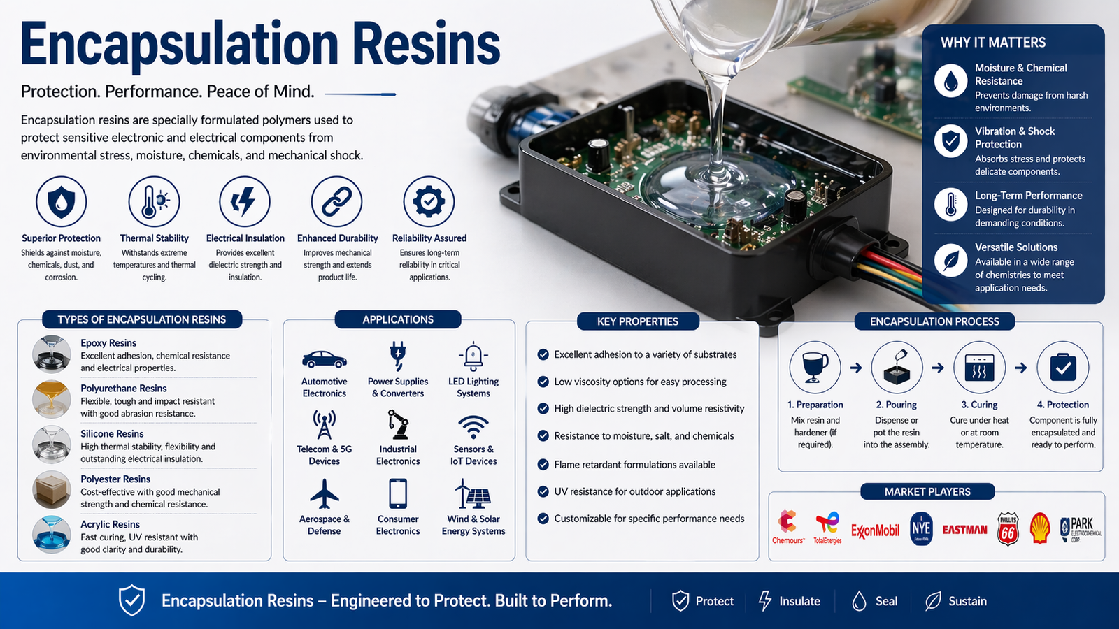 Encapsulation resins are advanced protective materials used to coat and safeguard components from moisture, heat, chemicals, and environmental stress. These resins are widely utilized across electronics, automotive, construction, and industrial sectors due to their excellent insulation properties, durability, and ability to enhance product lifespan.
