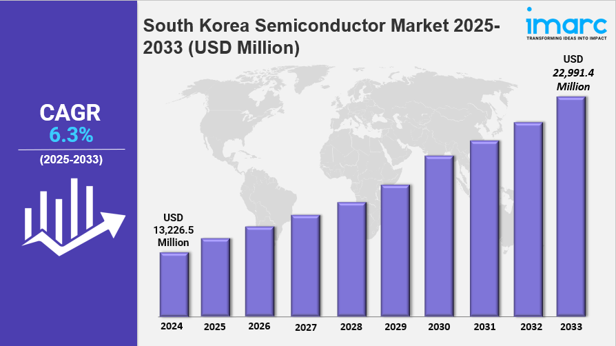 The South Korea semiconductor market size reached USD 13,226.5 Million in 2024 and is expected to grow to USD 22,991.4 Million by 2033, demonstrating a CAGR of 6.3% during the forecast period 2025-2033. The growth is driven primarily by increasing demand for electronics and connectivity across consumer and industrial sectors, alongside the rising usage of wearable devices. This market analysis covers various components, materials used, end-user segments, and regional insights within South Korea's semiconductor industry.