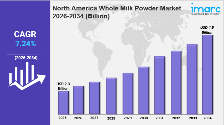 The North America whole milk powder market size reached USD 2.3 Billion in 2025. Looking forward, IMARC Group expects the market to reach USD 4.5 Billion by 2034, exhibiting a growth rate (CAGR) of 7.24% during 2026-2034.