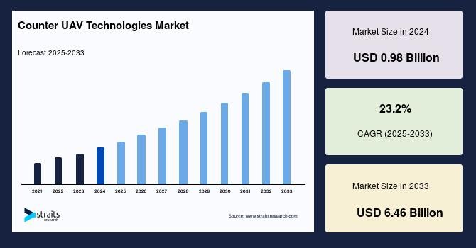According to StraitsResearch, the global counter uav technologies market size was valued at USD 0.98 billion in 2024 and is estimated to reach USD 6.46 billion by 2033, growing at a CAGR of 23.2% during 2025-2033.