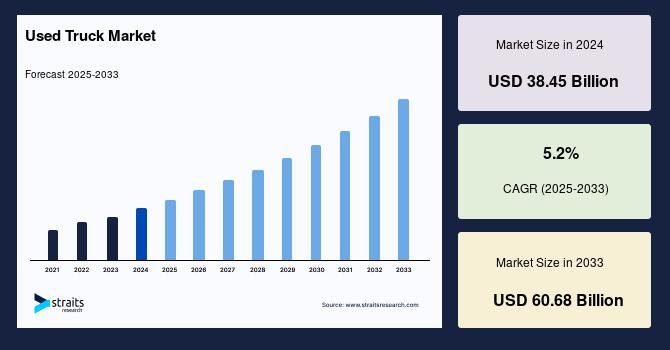 According to StraitsResearch, the global used truck market size was valued at USD 38.45 billion in 2024 and is estimated to reach USD 60.68 billion by 2033, growing at a CAGR of 5.2% during 2025-2033.