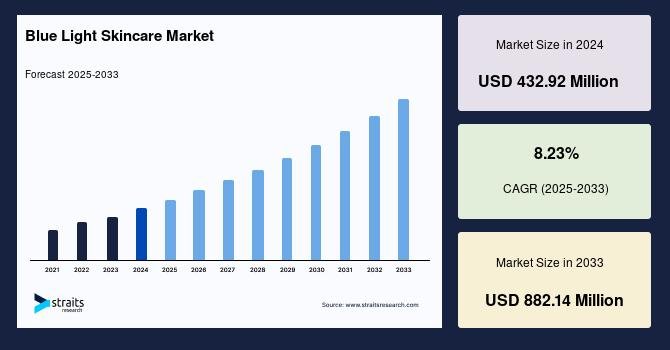 According to StraitsResearch, the global blue light skincare market size was valued at USD 432.92 million in 2024 and is estimated to reach USD 882.14 million by 2033, growing at a CAGR of 8.23% during 2025-2033.