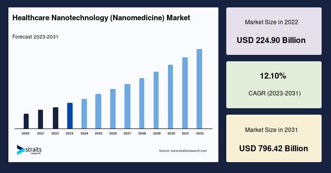 According to StraitsResearch, the global healthcare nanotechnology market size was valued at USD 224.90 billion in 2022 and is estimated to reach USD 796.42 billion by 2031, growing at a CAGR of 12.1% during 2023-2031.
