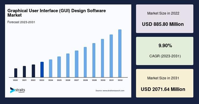 According to StraitsResearch, the global graphical user interface design software market size was valued at USD 885.80 million in 2022 and is estimated to reach USD 2071.64 million by 2031, growing at a CAGR of 9.9% during 2023-2031.