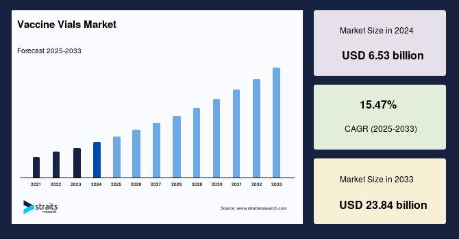 According to StraitsResearch, the global vaccine vials market size was valued at USD 6.53 billion in 2024 and is estimated to reach USD 23.84 billion by 2033, growing at a CAGR of 15.47% during 2025-2033.