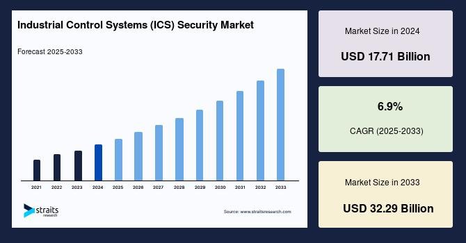 According to StraitsResearch, the global industrial control systems security market size was valued at USD 17.71 billion in 2024 and is estimated to reach USD 32.29 billion by 2033, growing at a CAGR of 6.9% during 2025-2033.