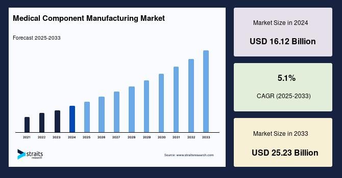 According to StraitsResearch, the global medical component manufacturing market size was valued at USD 16.12 billion in 2024 and is estimated to reach USD 25.23 billion by 2033, growing at a CAGR of 5.1% during 2025-2033.