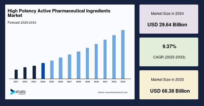 According to StraitsResearch, the global high potency active pharmaceutical ingredients market size was valued at USD 29.64 billion in 2024 and is estimated to reach USD high-potency-active-pharmaceutical-ingredients-market.38 billion by 2033, growing at a CAGR of 9.37% during 2025-2033.