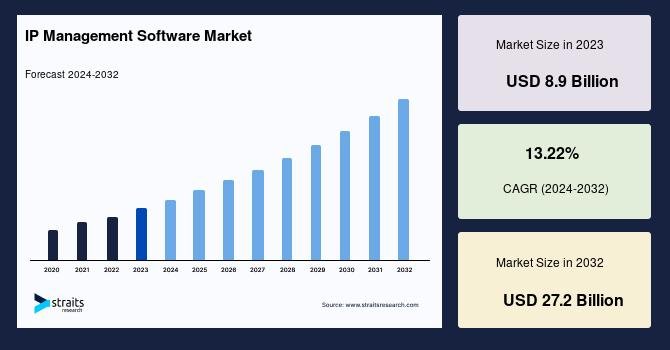 According to StraitsResearch, the global ip management software market size was valued at USD 8.9 billion in 2023 and is estimated to reach USD 27.2 billion by 2032, growing at a CAGR of 13.22% during 2024-2032.