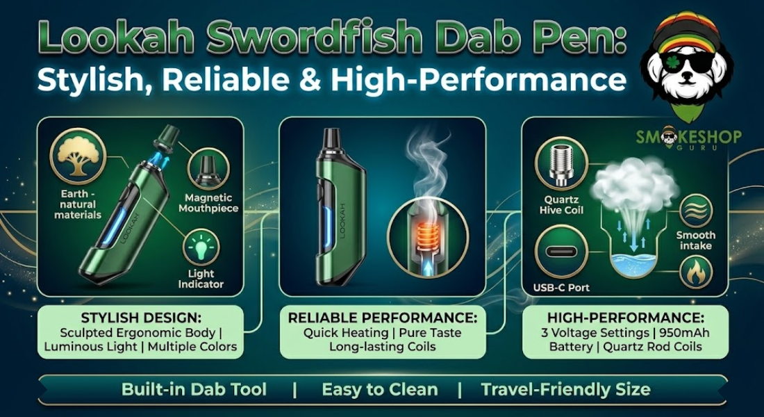 Experience the Lookah Swordfish Vaporizer at Smoke Shop Gurus. Featuring a 950mAh battery, magnetic clamshell lid, and quartz bucket heating for ultimate portability.