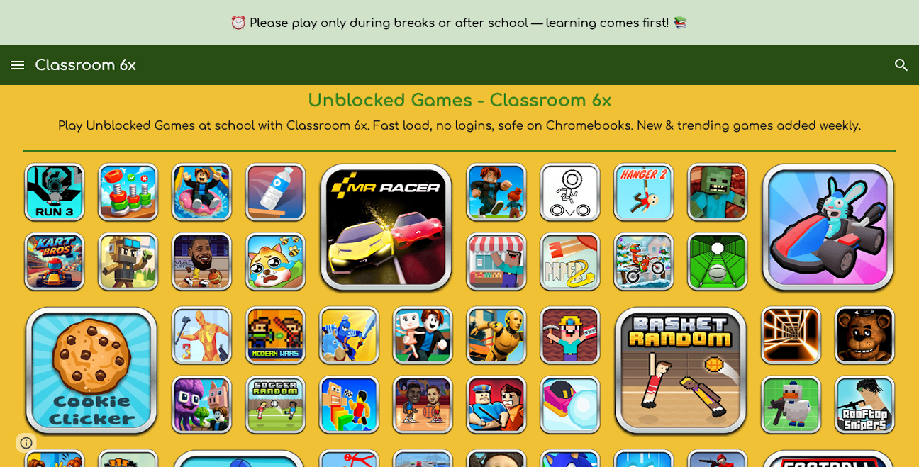 Classroom 6x is a popular unblocked games website where students can play fun online games safely at school. It offers hundreds of free browser-based games — including action, puzzles, racing, and strategy — all designed to load quickly and work without downloads. Perfect for quick breaks, stress relief, and classroom-friendly entertainment.